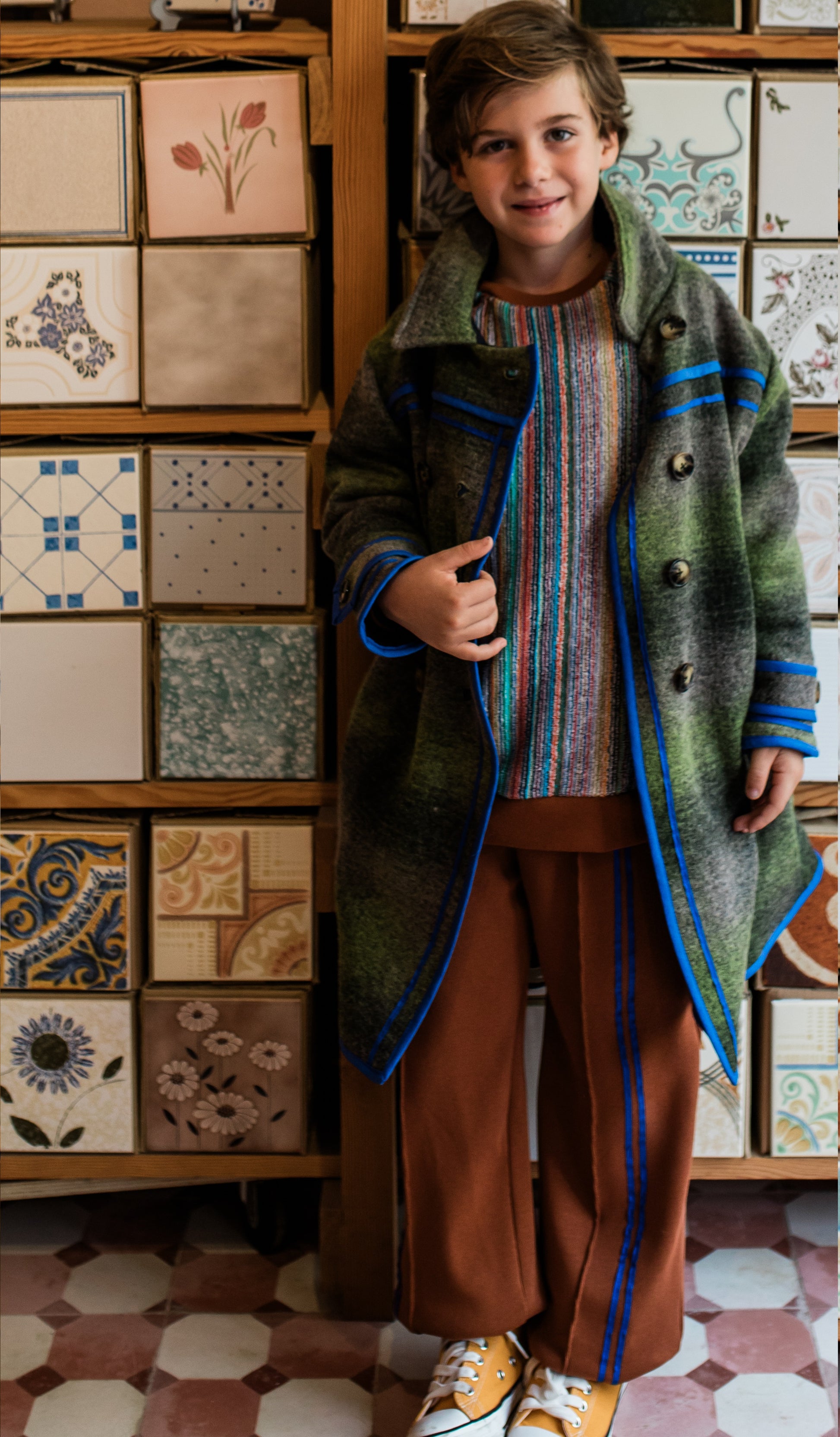 Vintage style coat with blue stripes details. It's made from old stock blankets, fastening with a double-breasted button front and has jersey lining.