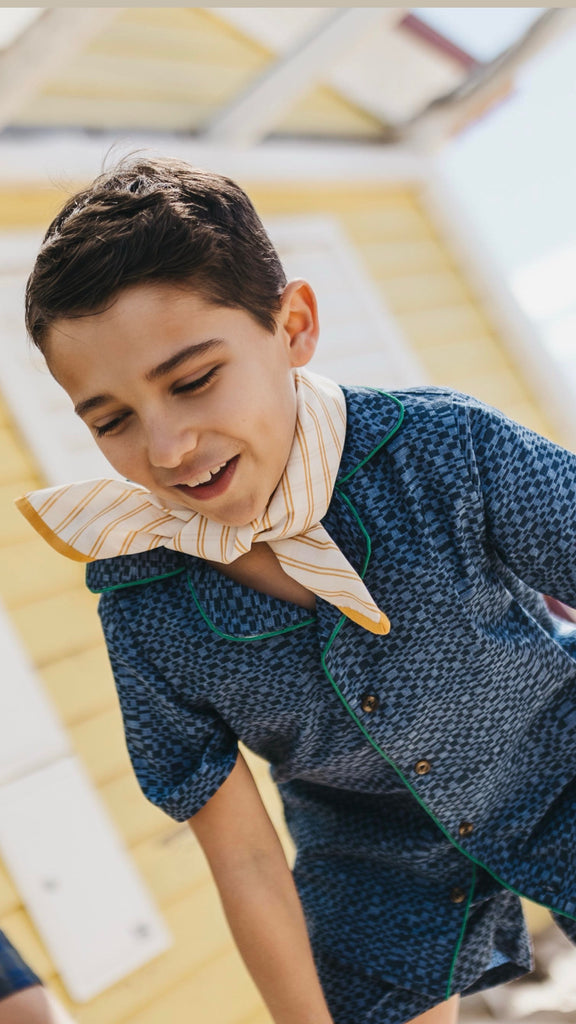 100% cotton denim shirt. Designed with tailored collar, short sleeves, front button fastening, an geometric print and loose fit. Made in Portugal