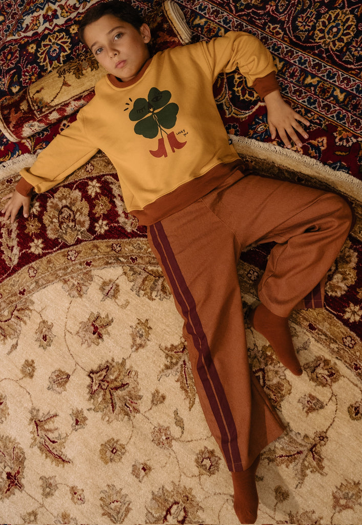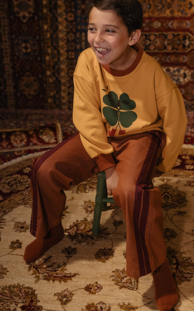 Caramel Denim pants with stripes details. Elastic waistband.