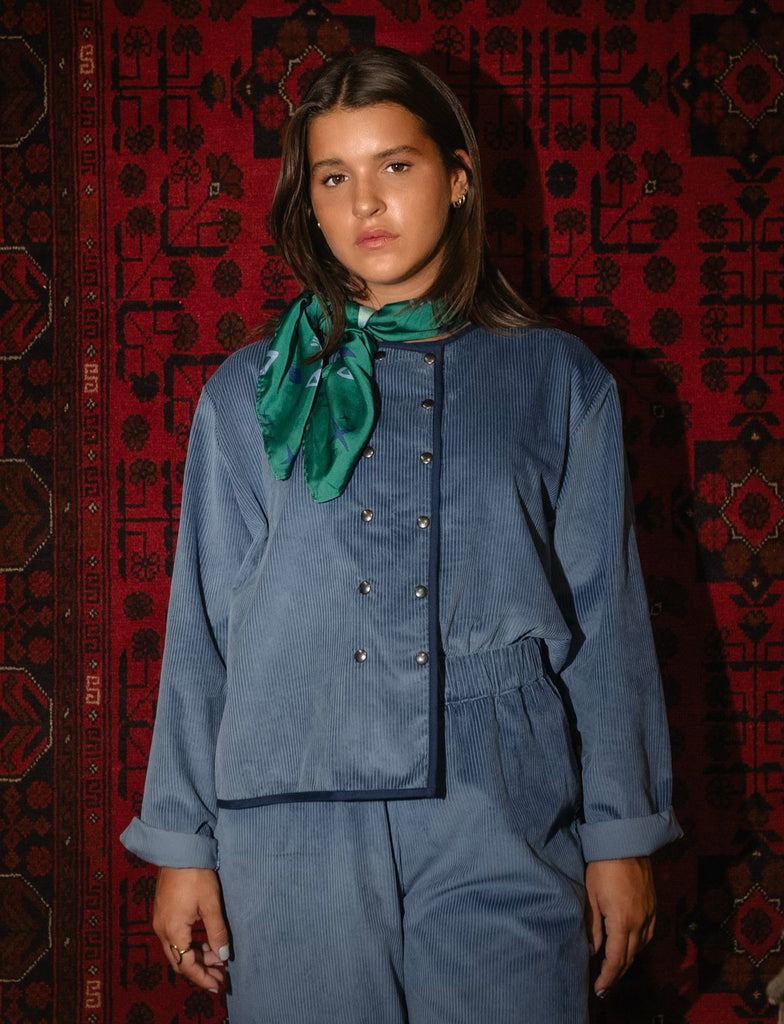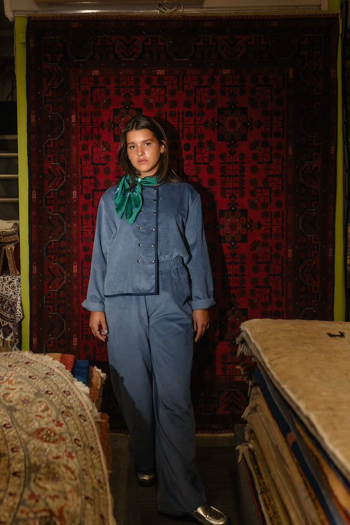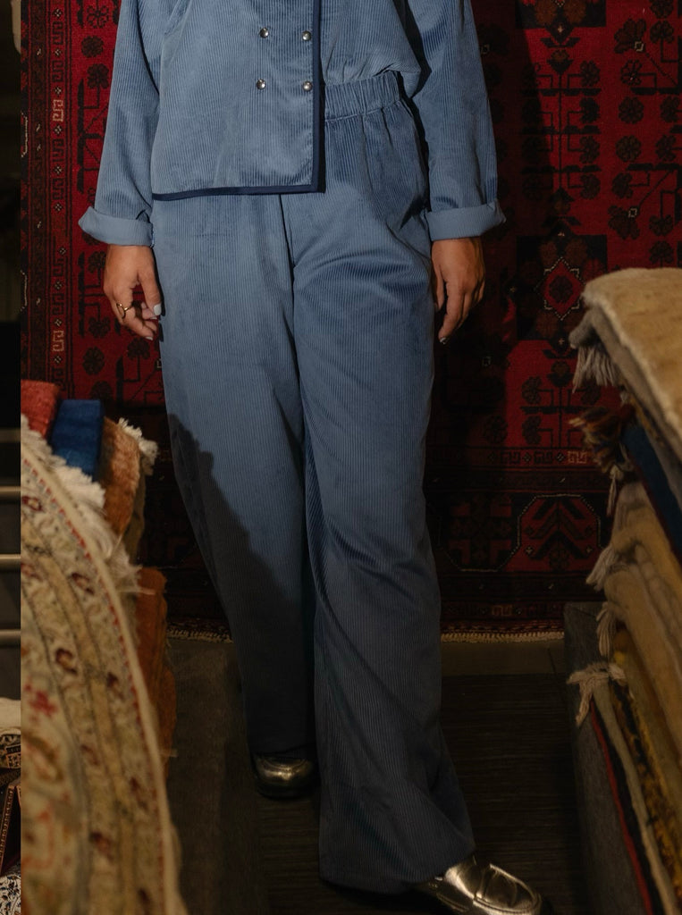 Corduroy pants. Elastic waistband and Two side pockets. Invisble side zipper
