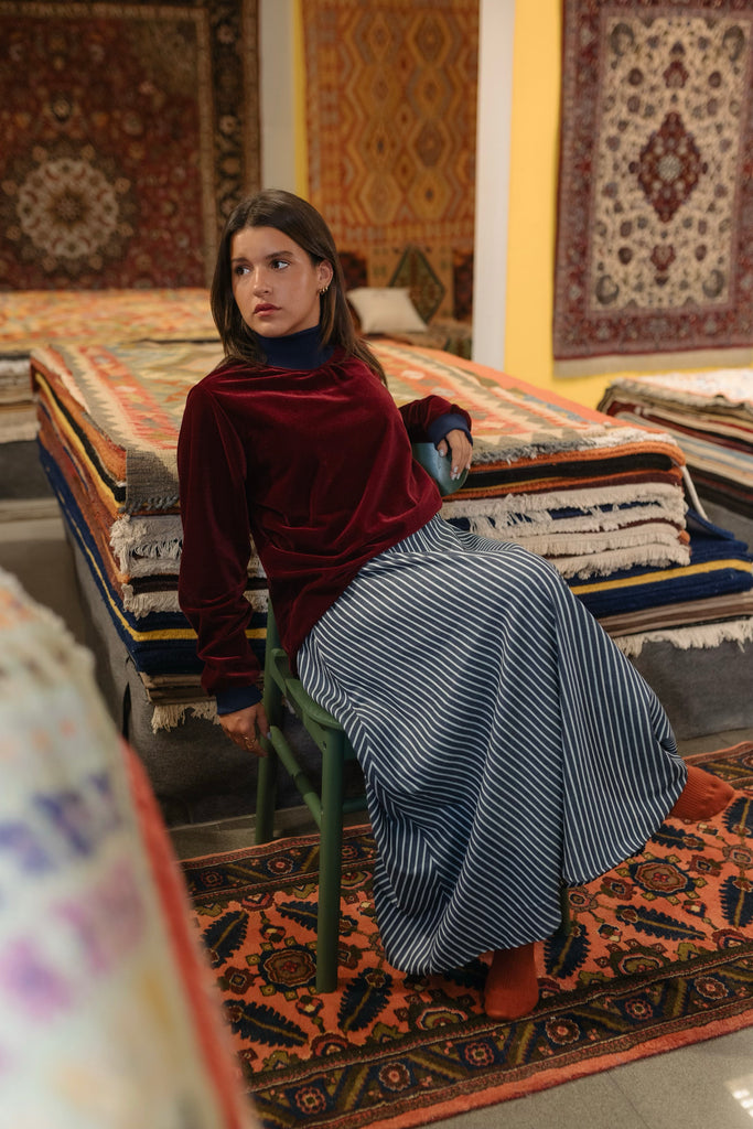 Long denim striped skirt. Elasticated waistband. Two pockets
